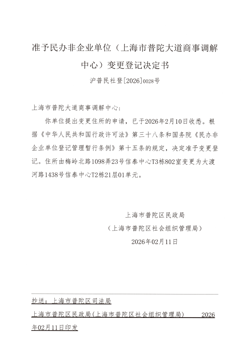 准予民办非企业单位(上海市普陀大道商事调解中心)变更登记决定书