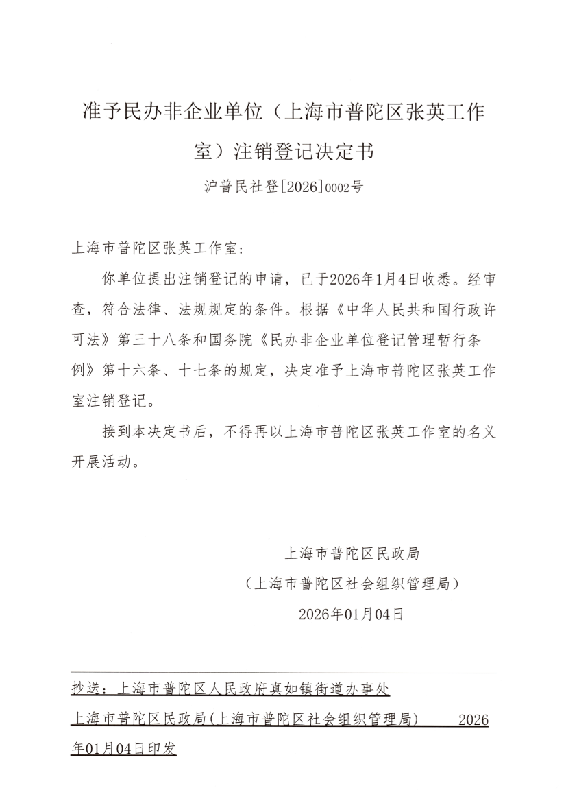 你单位提出注销登记的申请,已于2026年1月4日收悉。经审查,符合法律、法规规定的条件。根据《中华人民共和国行政许可法》第三十八条和国务院《民办非企业单位登记管理暂行条例》第十六条、十七条的规定,决定准予上海市普陀区张英工作室注销登记。