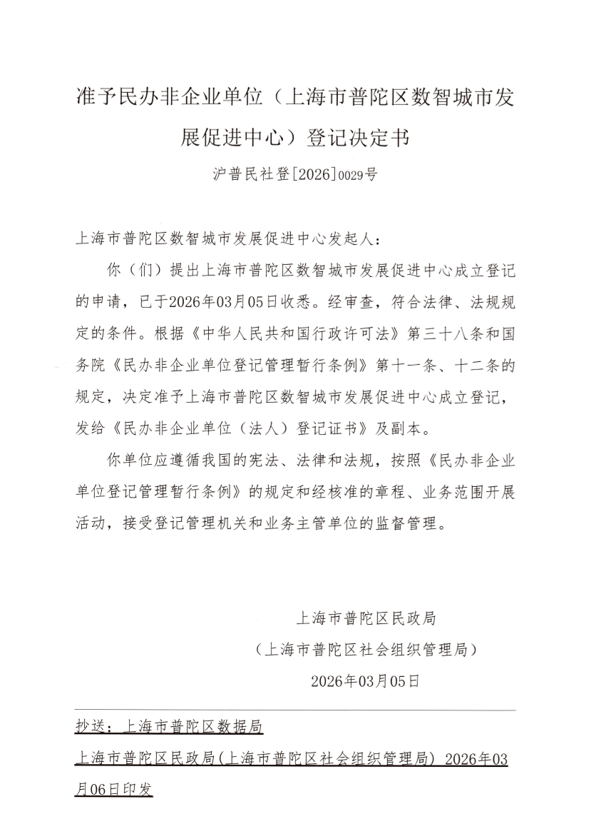 你(们)提出上海市普陀区数智城市发展促进中心成立登记的申请,已于2026年03月05日收悉。经审查,符合法律、法规规定的条件。根据《中华人民共和国行政许可法》第三十八条和国务院《民办非企业单位登记管理暂行条例》第十一条、十二条的规定,决定准予上海市普陀区数智城市发展促进中心成立登记,发给《民办非企业单位(法人)登记证书》及副本。