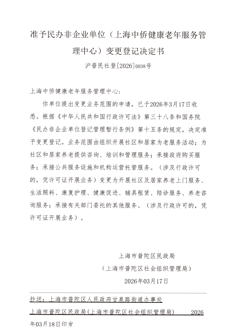 你单位提出变更业务范围的申请,已于2026年3月17日收悉。根据《中华人民共和国行政许可法》第三十八条和国务院《民办非企业单位登记管理暂行条例》第十五条的规定,决定准予变更登记。业务范围由组织开展社区和居家为老服务活动;为社区和居家养老提供咨询、培训和管理服务;承接政府购买服务;承接公共服务设施和机构运营托管服务。(涉及行政许可的,凭许可证开展业务)变更为开展社区及居家养老上门服务、生活照料、康复护理、健康促进、辅具租赁、陪诊服务、养老咨询服务;承接有关部门委托的其他服务。(涉及行政许可的,凭许可证开展业务)。