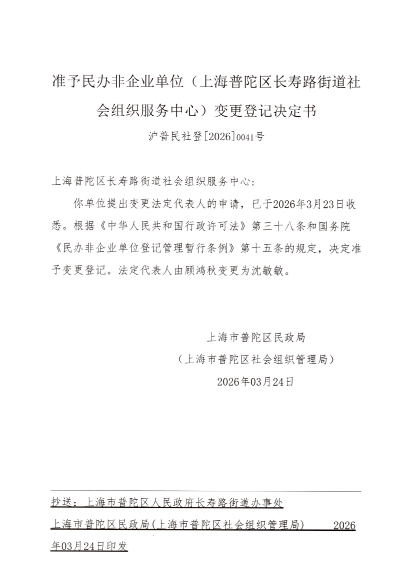 你单位提出变更法定代表人的申请,已于2026年3月23日收悉。根据《中华人民共和国行政许可法》第三十八条和国务院《民办非企业单位登记管理暂行条例》第十五条的规定,决定准予变更登记。法定代表人由顾鸿秋变更为沈敏敏。