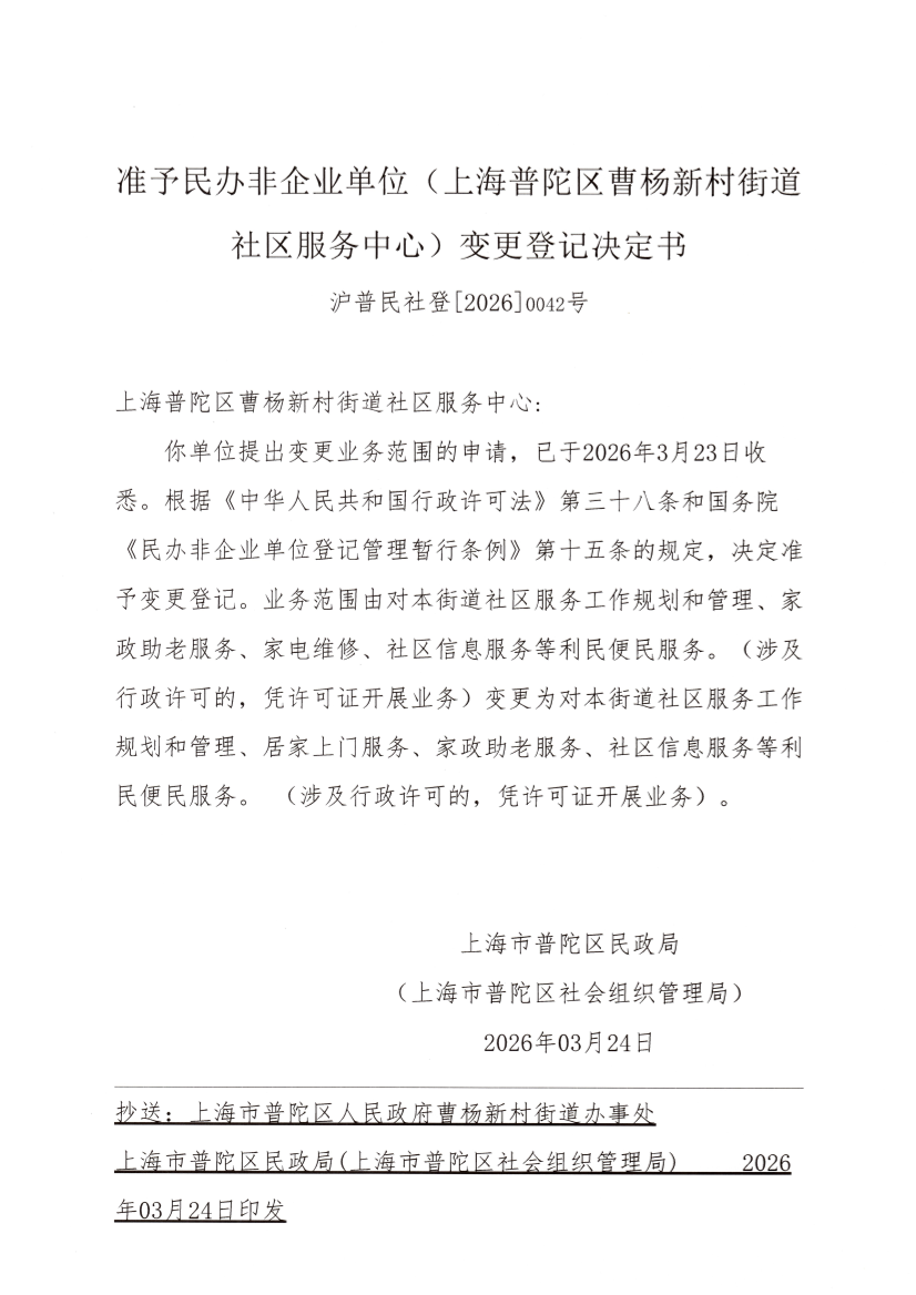 你单位提出变更业务范围的申请,已于2026年3月23日收悉。根据《中华人民共和国行政许可法》第三十八条和国务院《民办非企业单位登记管理暂行条例》第十五条的规定,决定准予变更登记。业务范围由对本街道社区服务工作规划和管理、家政助老服务、家电维修、社区信息服务等利民便民服务。(涉及行政许可的,凭许可证开展业务)变更为对本街道社区服务工作规划和管理、居家上门服务、家政助老服务、社区信息服务等利民便民服务。 (涉及行政许可的,凭许可证开展业务)。