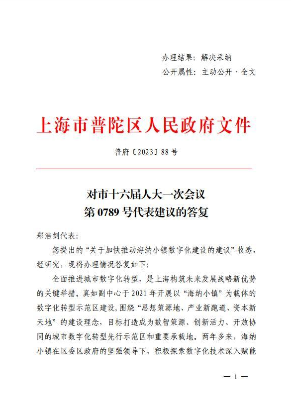 您提出的“关于加快推动海纳小镇数字化建设的建议”收悉,经研究,现将办理情况答复如下: