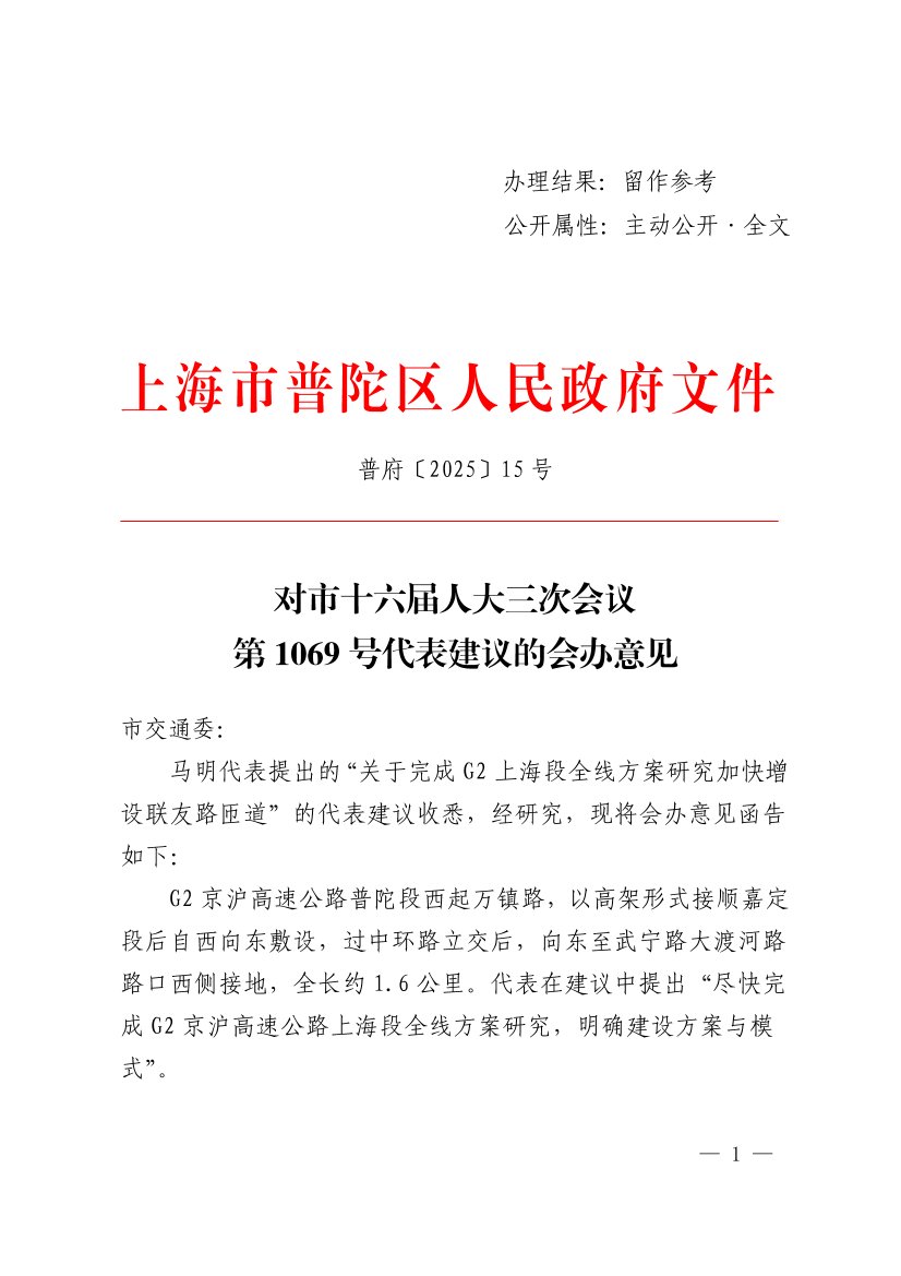 G2京沪高速公路普陀段西起万镇路,以高架形式接顺嘉定段后自西向东敷设,过中环路立交后,向东至武宁路大渡河路路口西侧接地,全长约1.6公里。代表在建议中提出“尽快完成G2京沪高速公路上海段全线方案研究,明确建设方案与模式”。