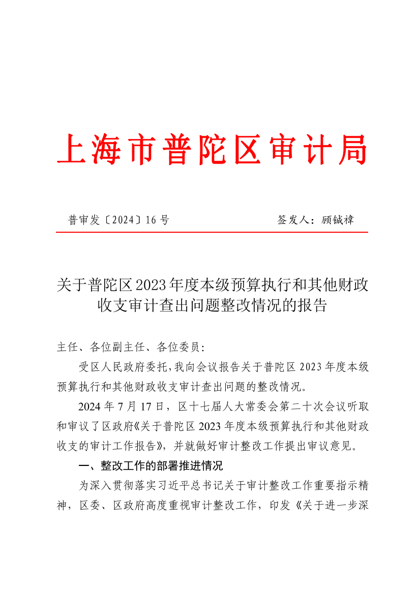 关于普陀区2023年度本级预算执行和其他财政收支审计查出问题整改情况的报告