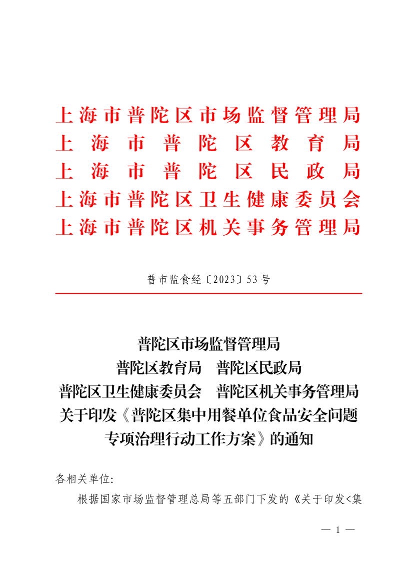 根据国家市场监督管理总局等五部门下发的《关于印发<集中用餐单位食品安全问题专项治理行动工作方案>的通知》(国市监食协发〔2023〕65号)和市市场监管局等五部门印发的《关于印发<上海市集中用餐单位食品安全问题专项治理行动工作方案>的通知》(沪市监食经〔2023〕470号)的要求,结合辖区实际情况,区市场监管局、区教育局、区民政局、区卫生健康委、区机管局联合制定了《普陀区集中用餐单位食品安全问题专项治理行动工作方案》。现印发给你们,请认真贯彻执行。