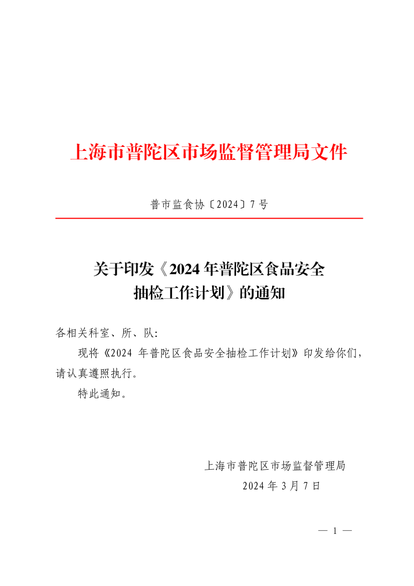 关于印发《2024年普陀区食品安全抽检工作计划》的通知