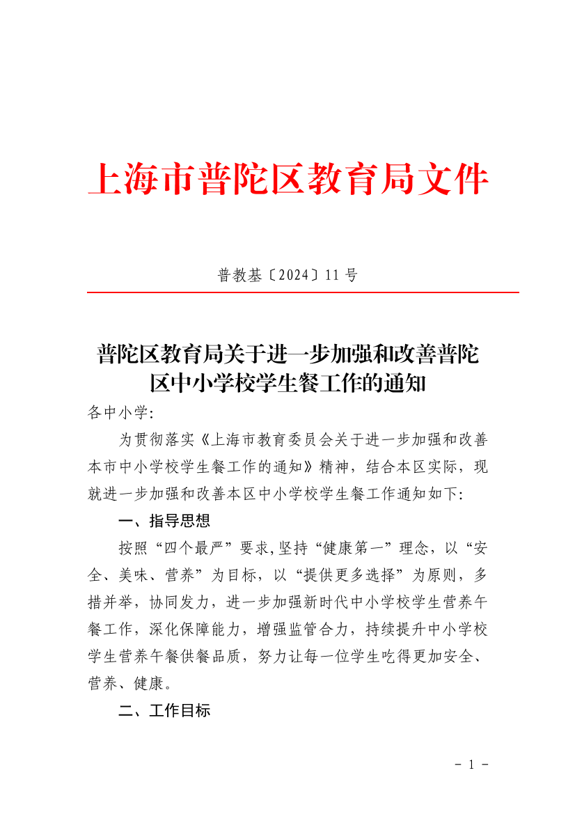 关于进一步加强和改善普陀区中小学校学生餐工作的通知