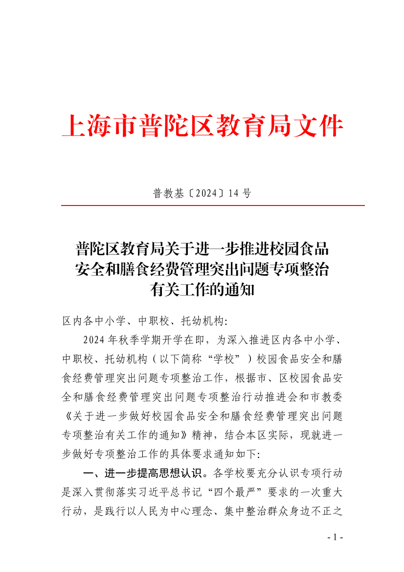 2024年秋季学期开学在即,为深入推进区内各中小学、中职校、托幼机构(以下简称“学校”)校园食品安全和膳食经费管理突出问题专项整治工作,根据市、区校园食品安全和膳食经费管理突出问题专项整治行动推进会和市教委《关于进一步做好校园食品安全和膳食经费管理突出问题专项整治有关工作的通知》精神,结合本区实际,现就进一步做好专项整治工作的具体要求通知如下: