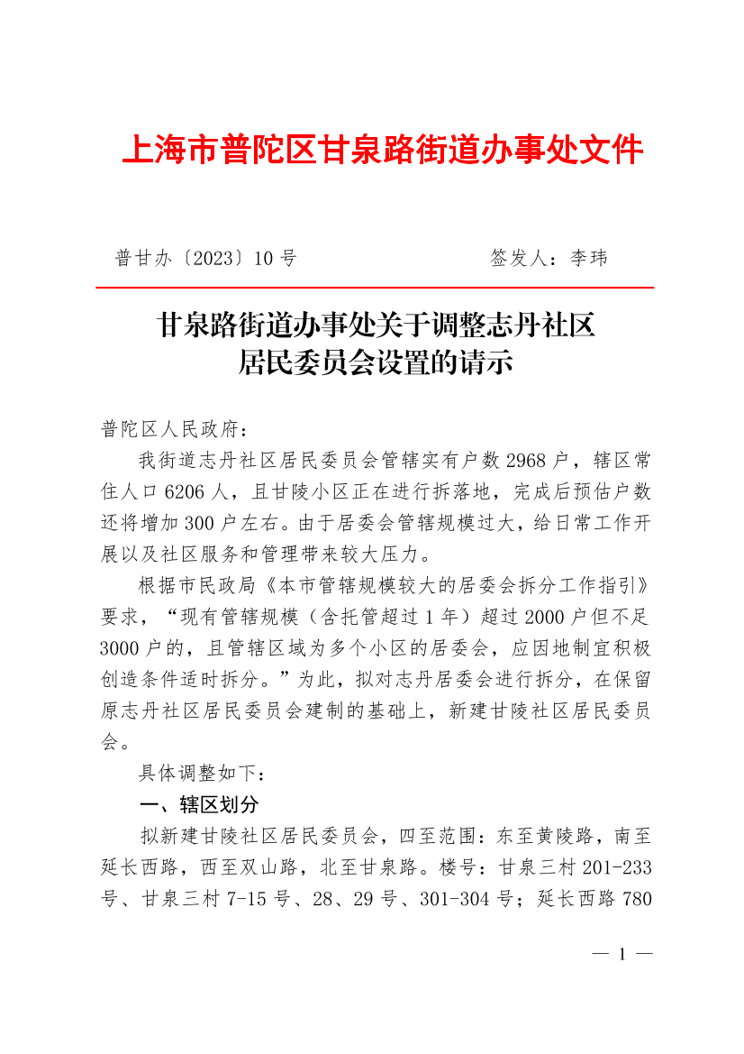 甘泉路街道办事处关于调整志丹社区居民委员会设置的请示