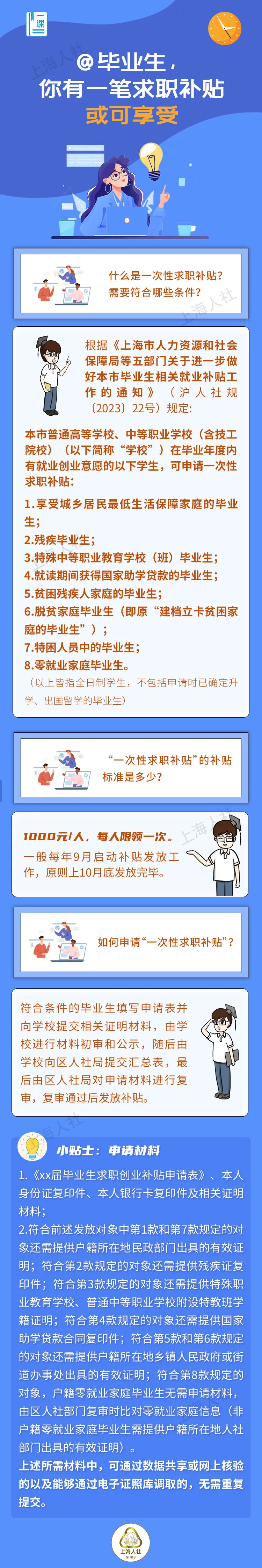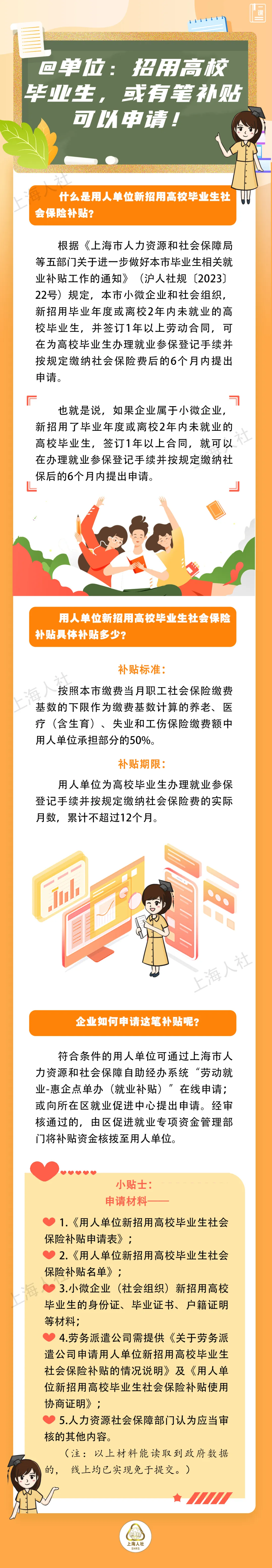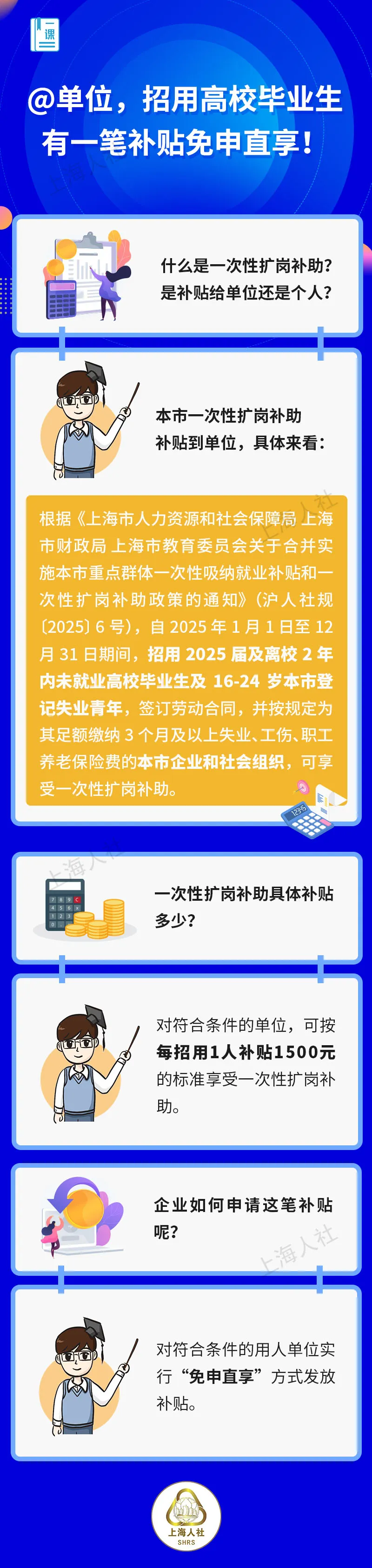 2025年06月03日 来源: 上海普陀近日,本市发布《关于做好2025年上海市高校毕业生就业创业工作的通知》,重点围绕促就业政策引领、就业指导与精准帮扶、就业创业赋能强化等推出29项具体举措。其中,市人社部门为助力高校毕业生高质量充分就业,推出了“一次性扩岗补助”、“用人单位新招用高校毕业生社会保险补贴”、“一次性求职补贴”、“离校未就业高校毕业生灵活就业社会保险补贴”、“青年就业创业见习补贴”等一揽子政策。下面,请看市人社局详解集锦: