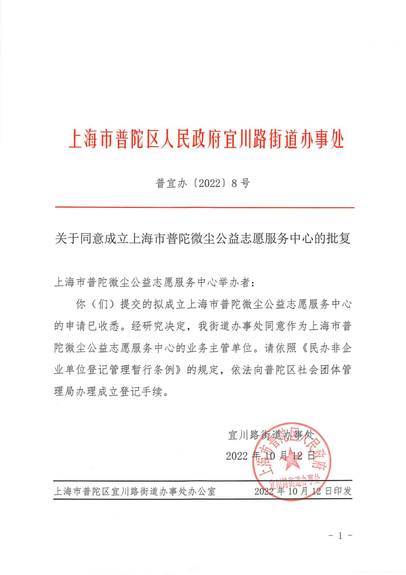 你(们)提交的拟成立上海市普陀微尘公益志愿服务中心的申请已收悉。经研究决定,我街道办事处同意作为上海市普陀微尘公益志愿服务中心的业务主管单位。请依照《民办非企业单位登记管理暂行条例》的规定,依法向普陀区社会团体管理局办理成立登记手续。