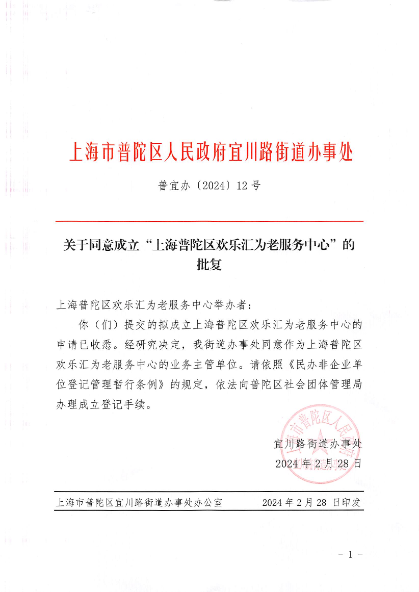 你(们)提交的拟成立上海普陀区欢乐汇为老服务中心的申请已收悉。经研究决定,我街道办事处同意作为上海普陀区享乐福为老服务中心的业务主管单位。请依照《民办非企业单位登记管理暂行条例》的规定,依法向普陀区社会团体管理局办理成立登记手续。
