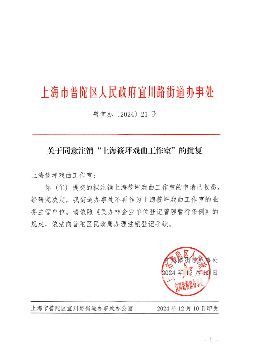 你 (们) 提交的拟注销上海筱坪戏曲工作室的申请已收悉。经研究决定,我街道办事处不再作为上海筱坪戏曲工作室的业务主管单位。请依照《民办非企业单位登记管理暂行条例》的规定,依法向普陀区民政局办理注销登记手续。