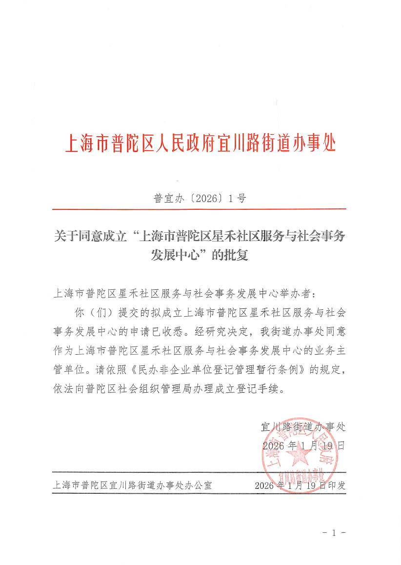 关于同意成立“上海市普陀区星禾社区服务与社会事务发展中心”的批复