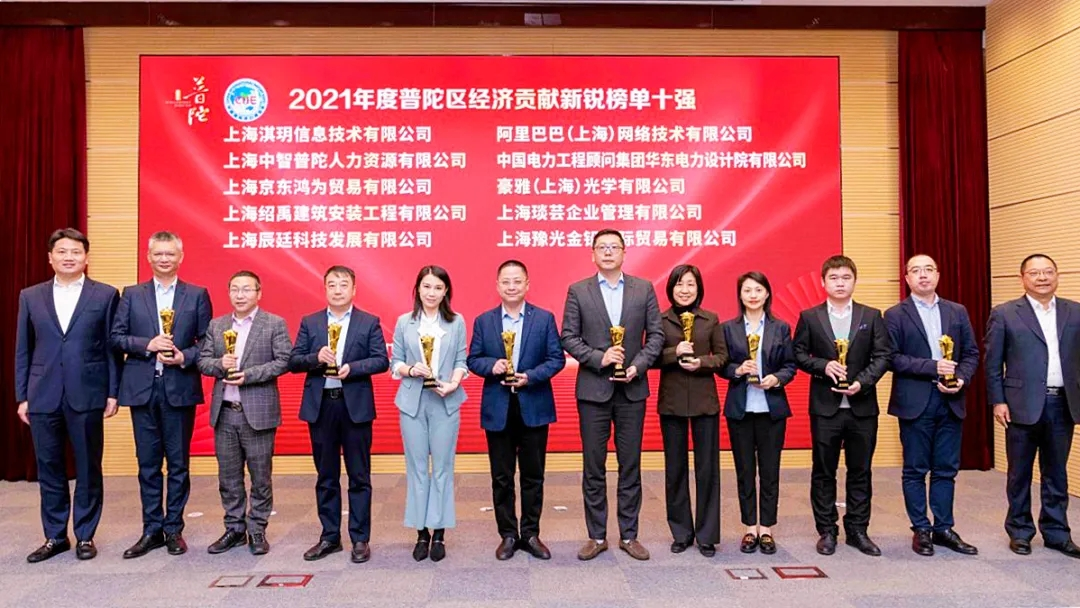 在区2021年第六次重点项目集中签约仪式后,豪雅(上海)光学有限公司作为2021年度普陀区经济贡献新锐榜单十强企业上台领奖。