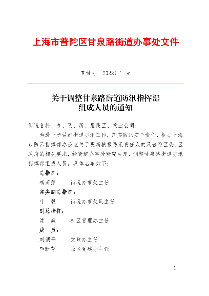 为进一步做好街道防汛工作,落实防汛安全责任,根据上海市防汛指挥部办公室关于更新核报防汛责任人的及普陀区委、区政府的相关要求,经街道办事处研究决定,调整甘泉路街道防汛指挥部组成人员,具体名单如下: