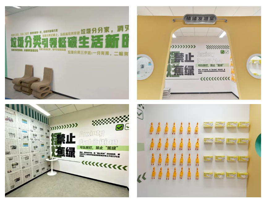 考虑到周边居民实际需求,420服务点提供现场人工回收服务。内部设有“玻金塑纸衣”五分类可回收物存放区域,由五个独立空间组成,每个分区都将对应品类的“再生资源墙”作为隔挡。墙体材料大部分采用分拣回收的纸盒、易拉罐、玻璃瓶等砌筑而成,并用这些材料拼凑出“沪尚回收”logo,整洁美观又一目了然。居民可以在这里体验“一站式”可回收物交投服务,工作人员将进行现场称重、透明计价、现金结算。便捷的回收方式让更多居民更有兴趣,也更积极地参与到资源循环利用的行动中。服务点突出“惠民便民”核心理念,满足餐食加热、驱寒避雨、紧急用药等临时性需求,为居民与户外工作者送上暖心关怀。特别设立“情绪发泄室”,墙面上写有“减负”方法和公益标语,各类解压玩具供居民释放和表达情绪,让负面情绪像“垃圾”一样投放回收。为填补服务点非开放时间段空缺,计划于中远两湾城东区2号门设置裸眼3D·空中成像非接触式可回收物精细化智能回收箱。居民可通过扫码、投放、称重、结算等一系列自助流程,随时享受高效便捷的可回收物交投服务。