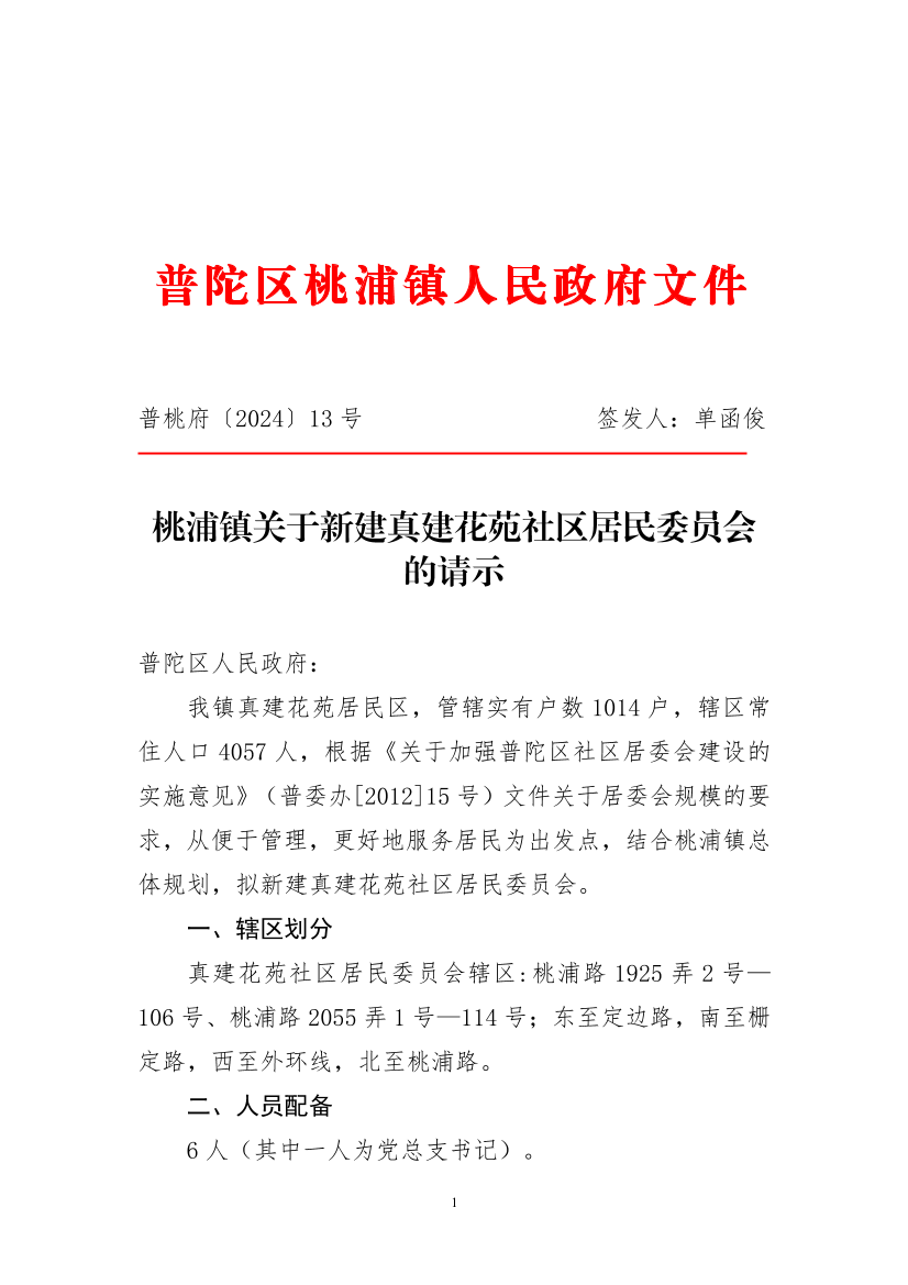 我镇真建花苑居民区,管辖实有户数1014户,辖区常住人口4057人,根据《关于加强普陀区社区居委会建设的实施意见》(普委办[2012]15号)文件关于居委会规模的要求,从便于管理,更好地服务居民为出发点,结合桃浦镇总体规划,拟新建真建花苑社区居民委员会。