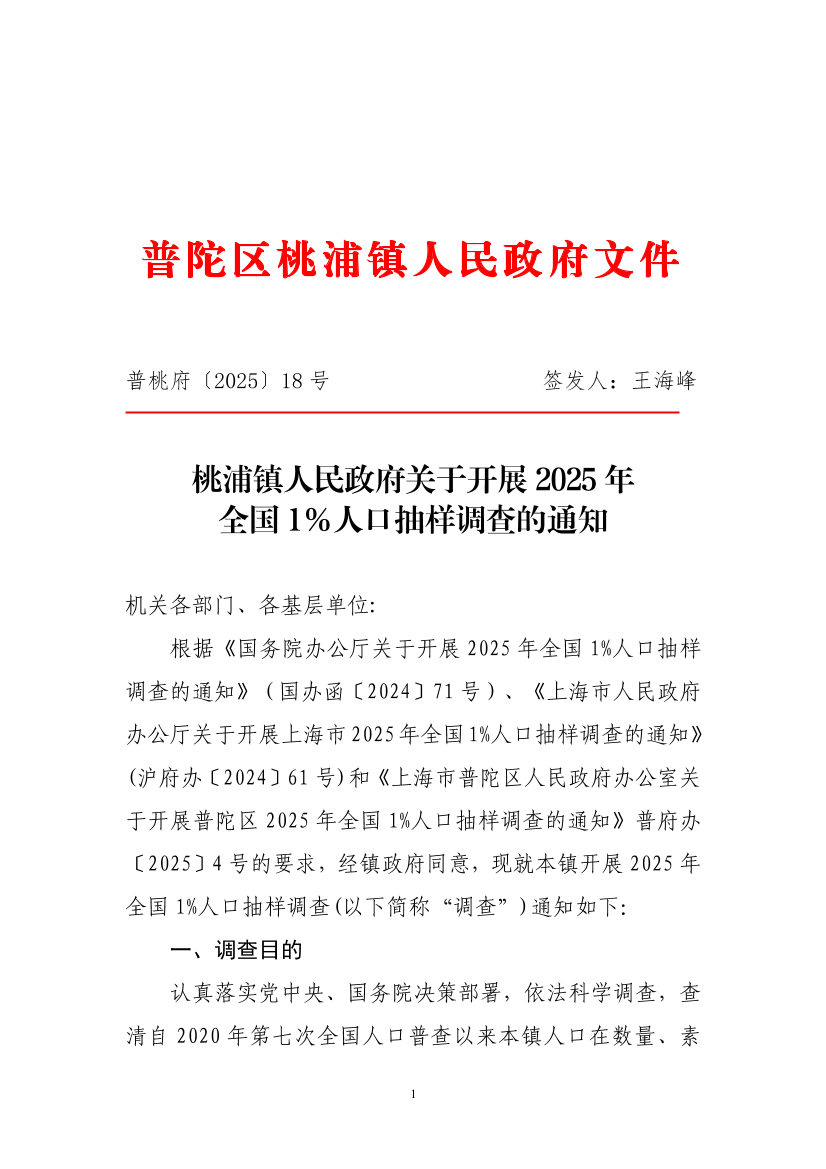 根据《国务院办公厅关于开展2025年全国1%人口抽样调查的通知》(国办函〔2024〕71号)、《上海市人民政府办公厅关于开展上海市2025年全国1%人口抽样调查的通知》(沪府办〔2024〕61号)和《上海市普陀区人民政府办公室关于开展普陀区2025年全国1%人口抽样调查的通知》普府办〔2025〕4号的要求,经镇政府同意,现就本镇开展2025年全国1%人口抽样调查(以下简称“调查”)通知如下: