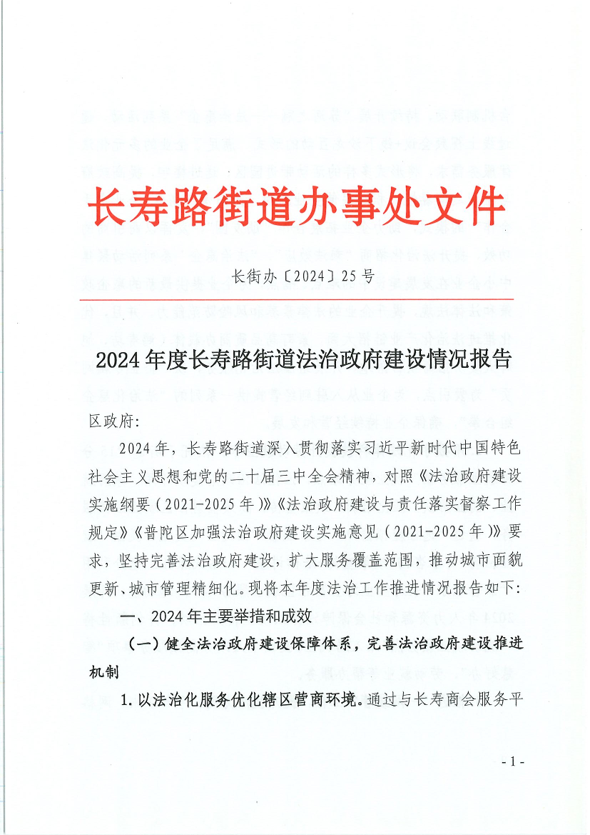 2024年,长寿路街道深入贯彻落实习近平新时代中国特色社会主义思想和党的二十届三中全会精神,对照《法治政府建设实施纲要(2021-2025年)》《法治政府建设与责任落实督察工作规定》《普陀区加强法治政府建设实施意见(2021-2025年)》要求,坚持完善法治政府建设,扩大服务覆盖范围,推动城市面貌更新、城市管理精细化。现将本年度法治工作推进情况报告如下:
