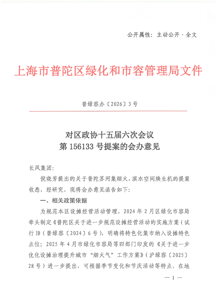 倪晓芳提出的关于普陀苏河集烟火,滨水空间焕生机的提案收悉,经研究,现将会办意见函告如下: