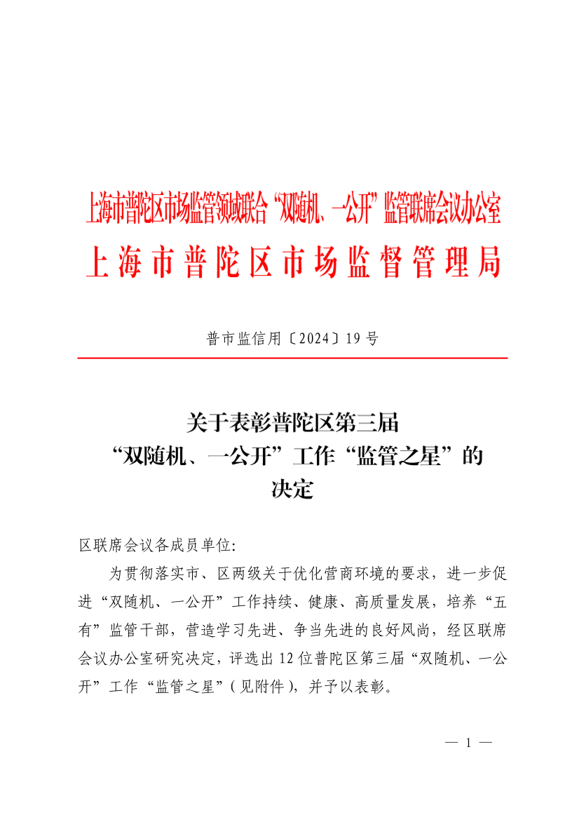关于表彰普陀区第三届“双随机、一公开”工作“监管之星”的决定