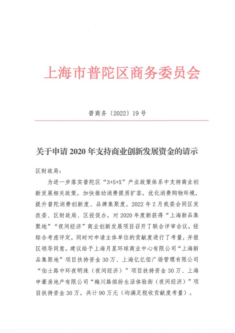 为进一步落实普陀区“3+5+X”产业政策体系中支持商业创新发展相关政策,加快推动消费提质扩容,优化消费购物环境,提升普陀消费创新度、品牌集聚度,2022年2月我委会同区发改委、区财政局、区投促办,对2020年度新获得“上海新品集聚地”“夜间经济”商业创新发展项目召开了联合评审会议。经综合考虑评定,同时对申请主体单位的贡献度进行了考量,并报区领导同意。建议给予上海月星环球商业中心有限公司“上海新品集聚地”项目扶持资金30万、上海亿亿佰广场管理有限公司“伯士路中环夜明珠(夜间经济)”项目扶持资金30万、上海申豪房地产有限公司“梅川路缤纷生活体验街(夜间经济)”项目扶持资金30万,共计90万元(均满足税收贡献度考量)。