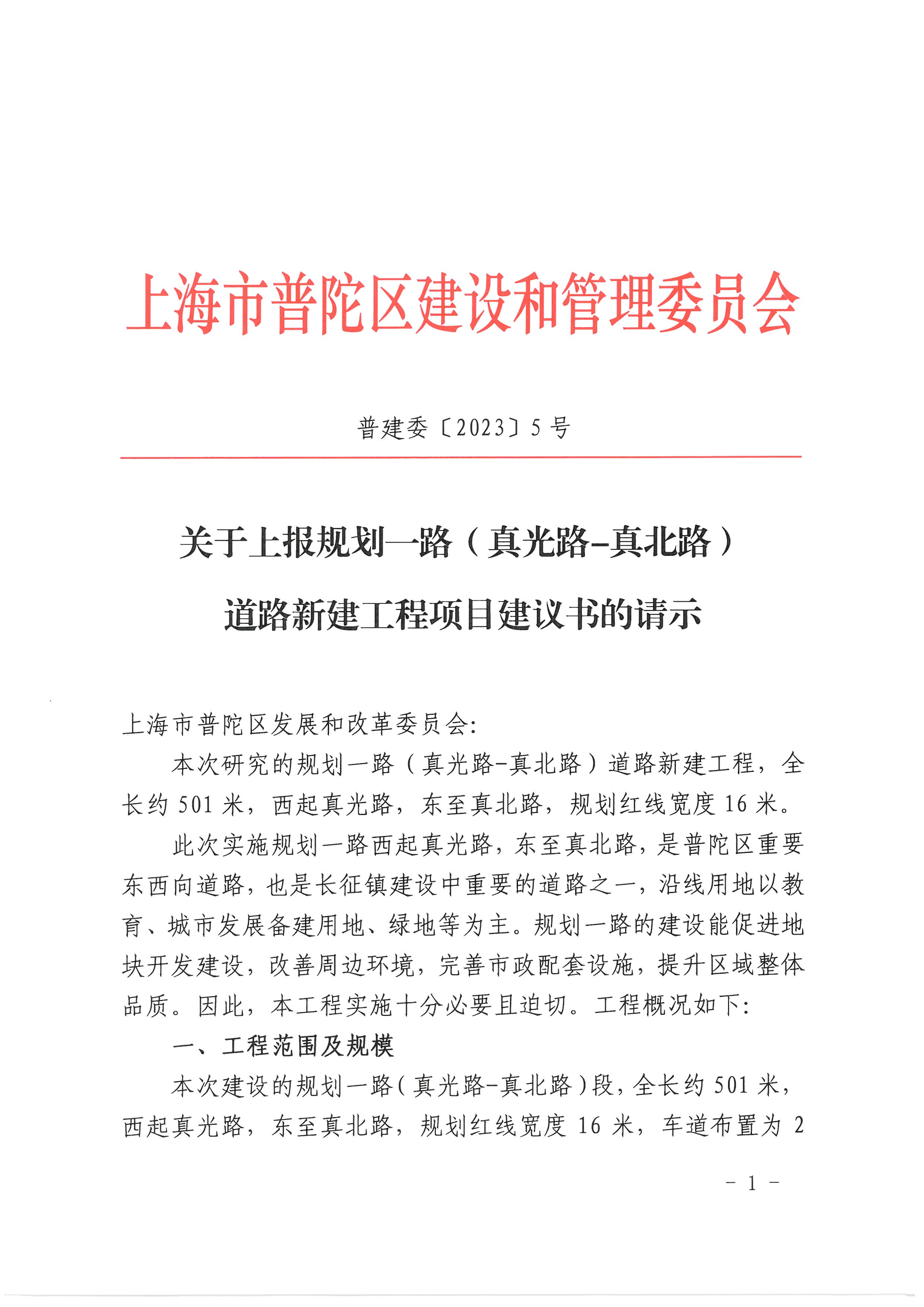 关于上报规划一路(真光路-真北路)道路新建工程项目建议书的请示
