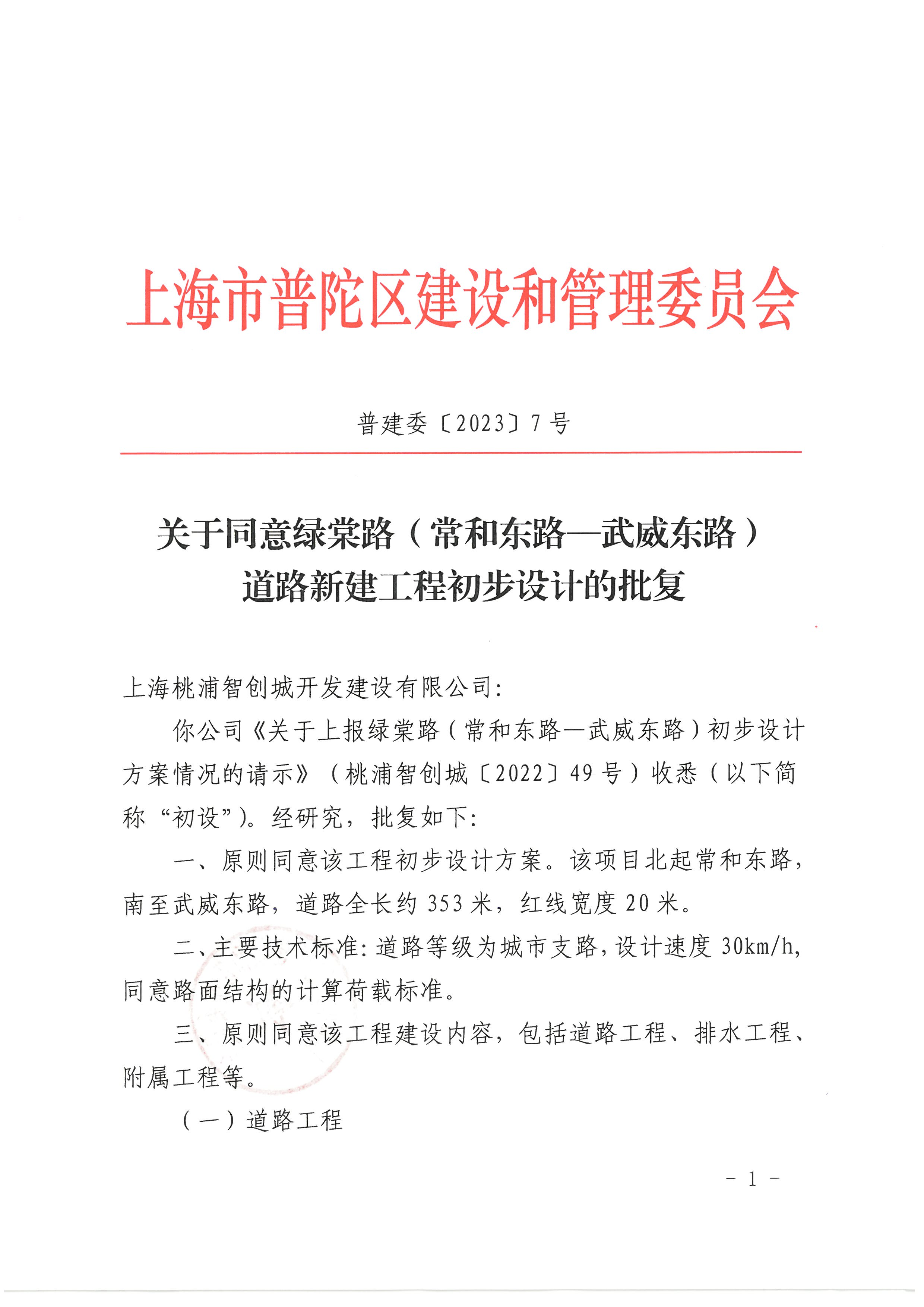 你公司《关于上报绿棠路(常和东路—武威东路)初步设计方案情况的请示》(桃浦智创城〔2022〕49号)收悉(以下简称“初设”)。经研究,批复如下: