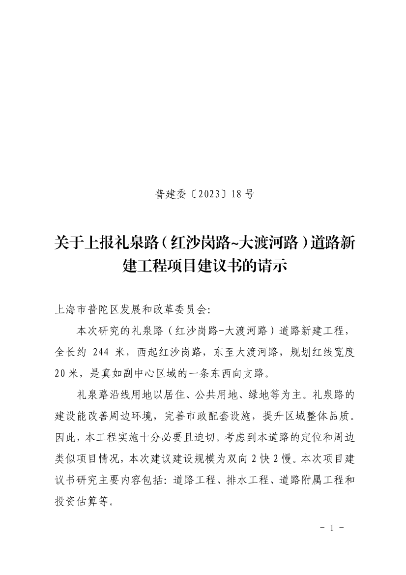 关于上报礼泉路(红沙岗路~大渡河路)道路新建工程项目建议书的请示