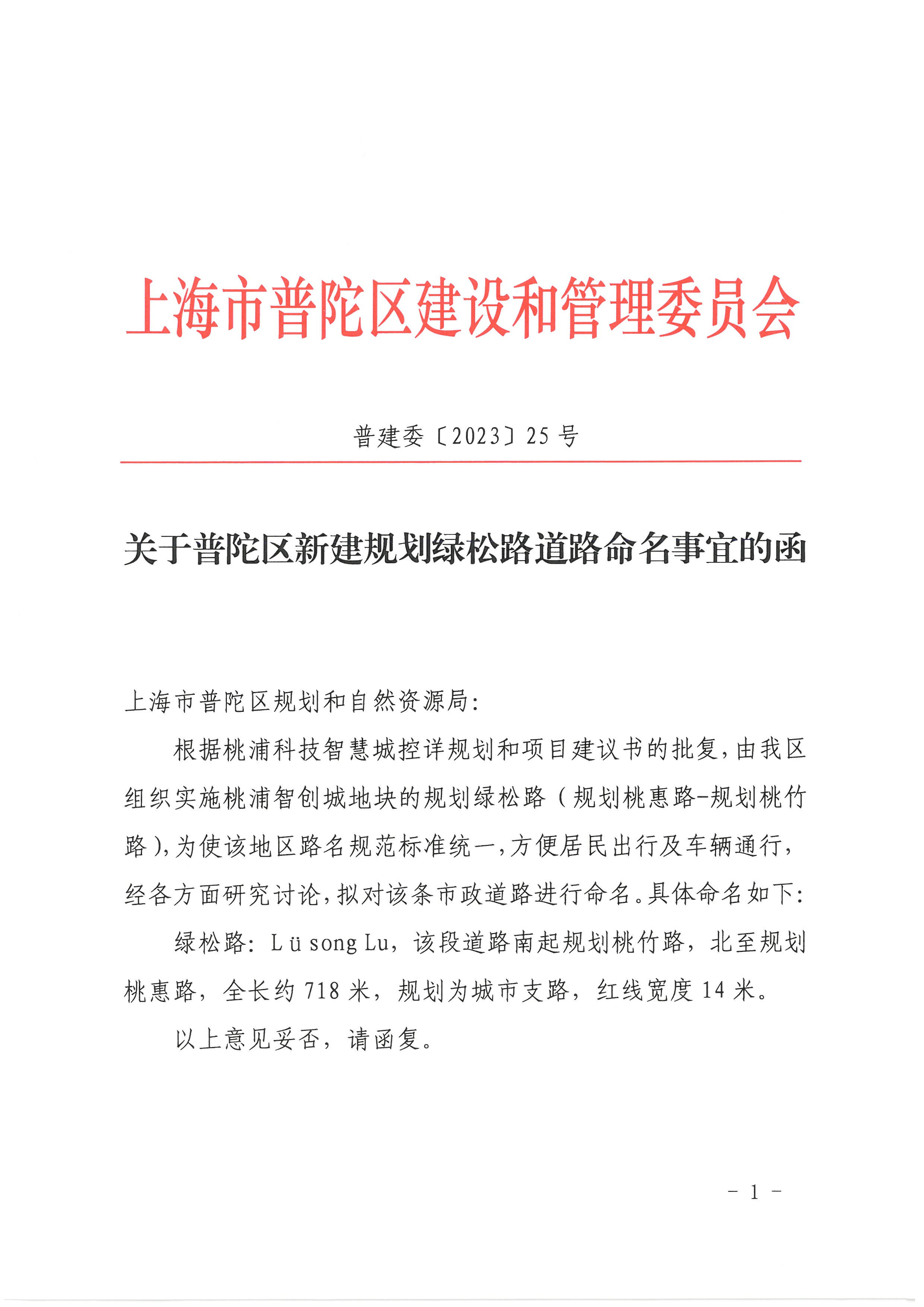 根据桃浦科技智慧城控详规划和项目建议书的批复,由我区组织实施桃浦智创城地块的规划绿松路(规划桃惠路-规划桃竹路),为使该地区路名规范标准统一,方便居民出行及车辆通行,经各方面研究讨论,拟对该条市政道路进行命名。具体命名如下: