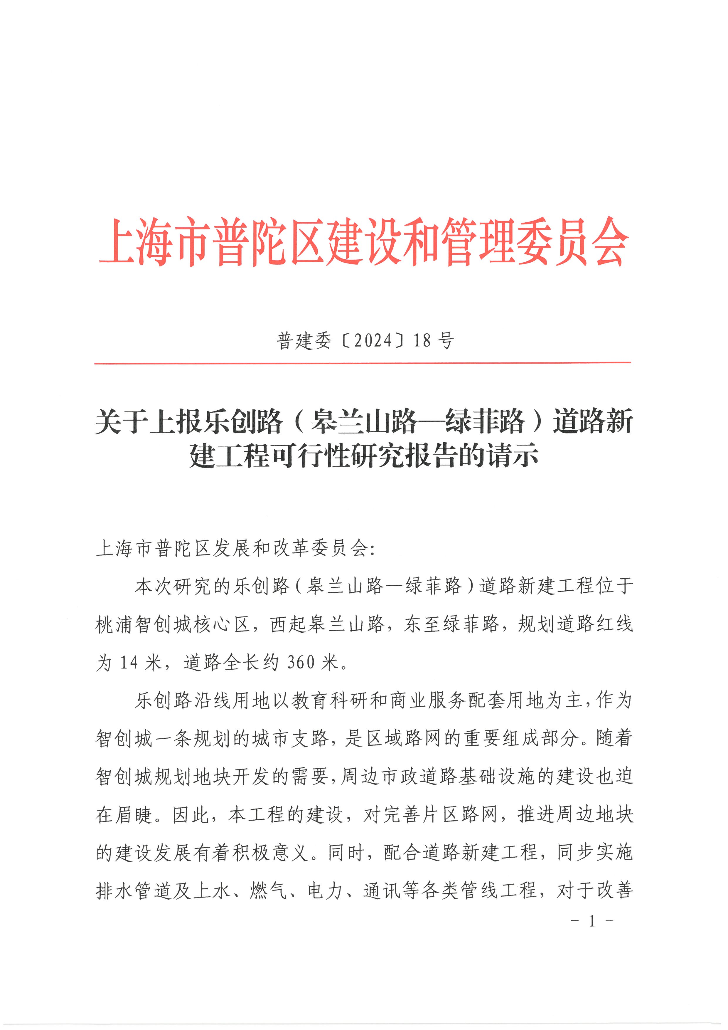 关于上报乐创路(皋兰山路—绿菲路)道路新建工程可行性研究报告的请示