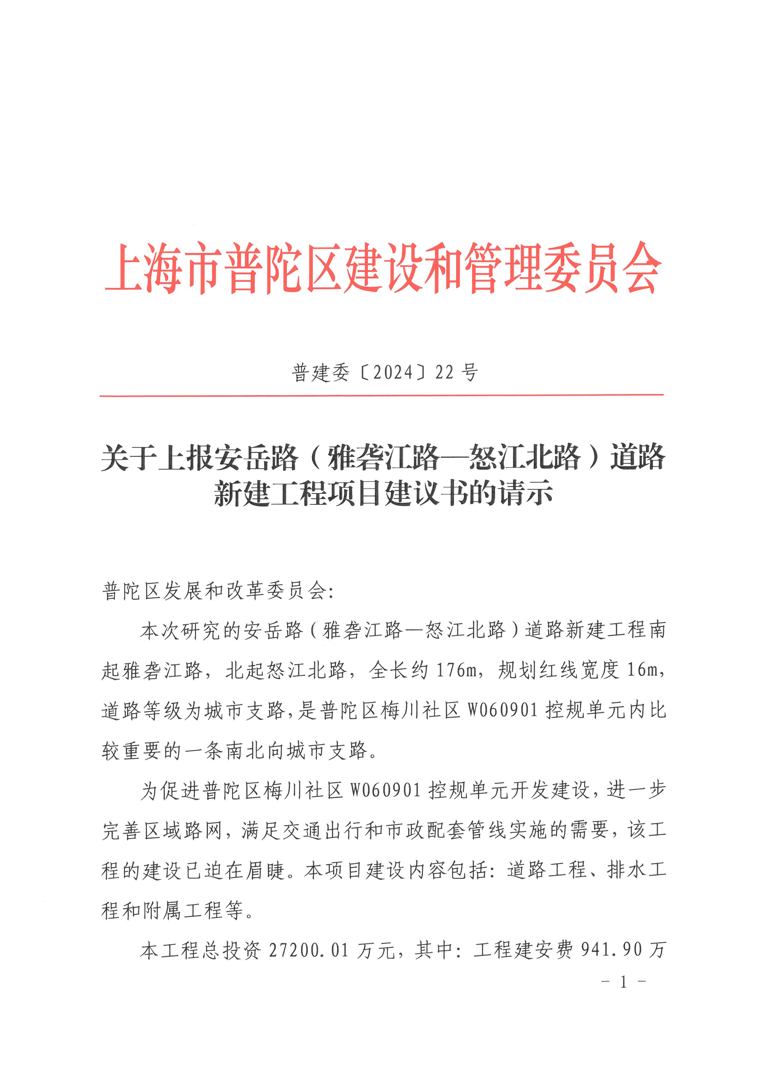 关于上报安岳路(雅砻江路—怒江北路)道路新建工程项目建议书的请示