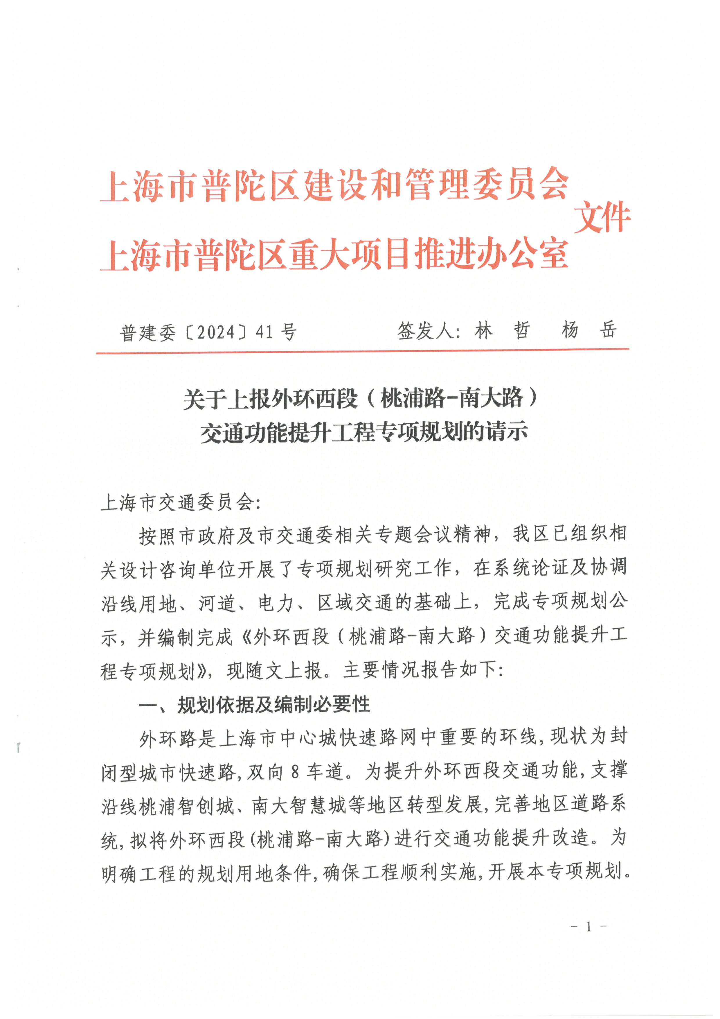 关于上报外环西段(桃浦路-南大路)交通功能提升工程专项规划的请示