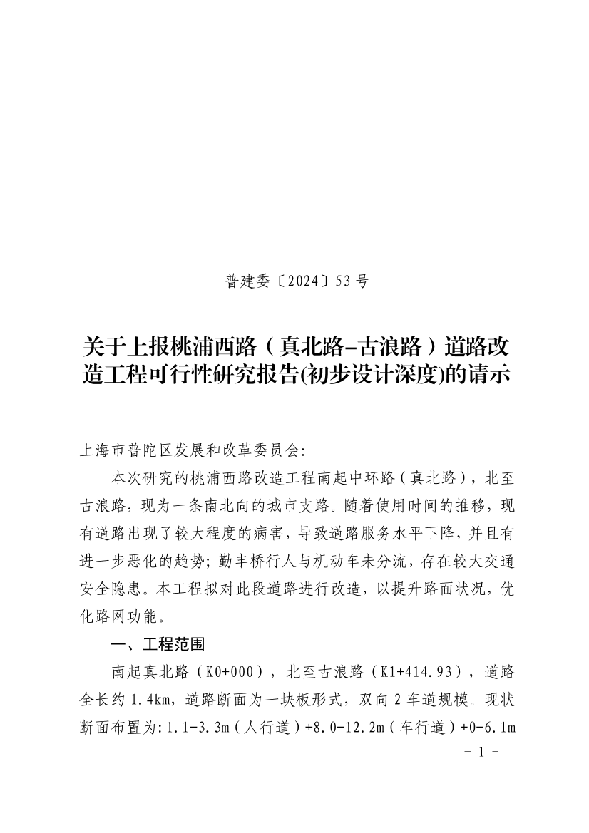 关于上报桃浦西路(真北路-古浪路)道路改造工程可行性研究报告(初步设计深度)的请示