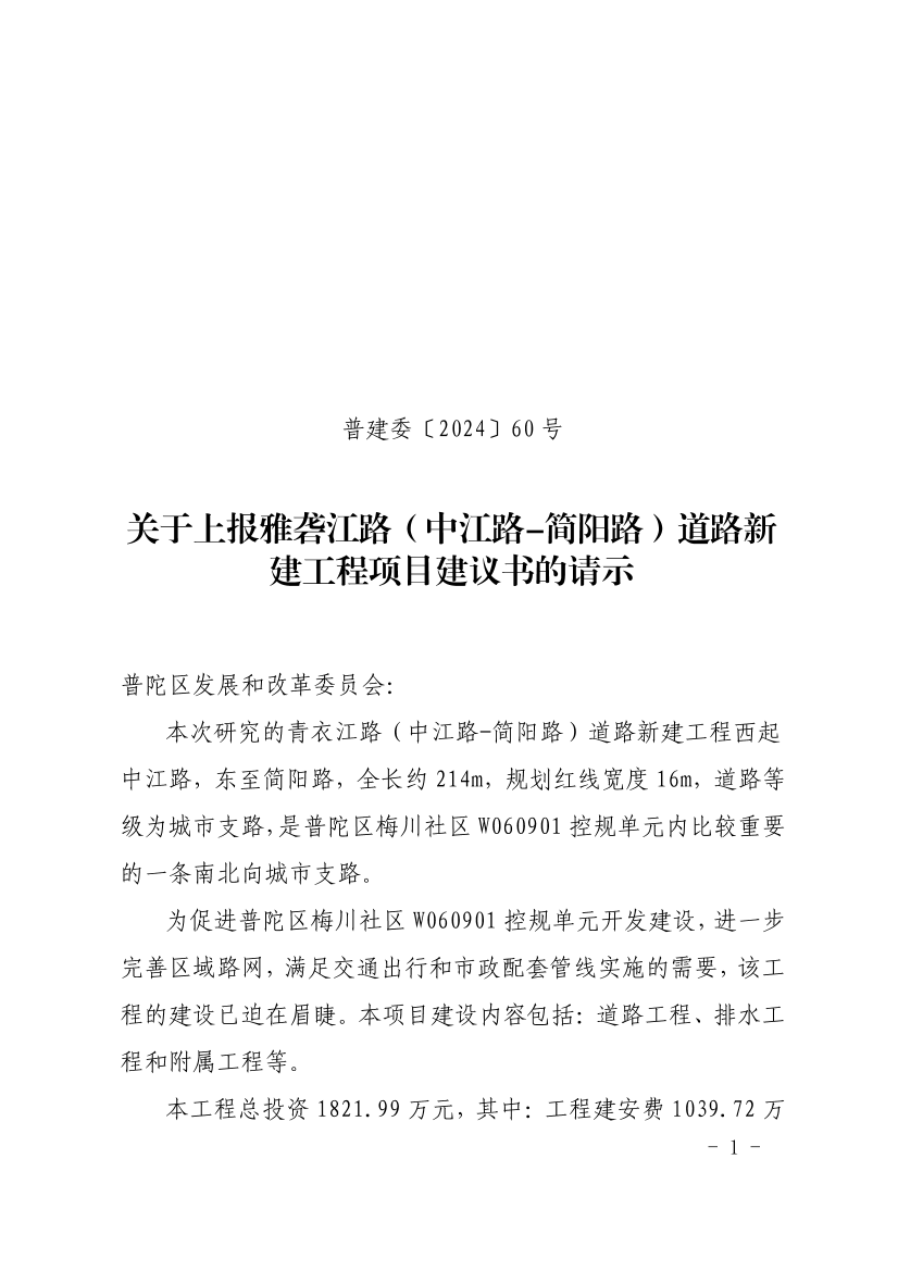 关于上报雅砻江路(中江路-简阳路)道路新建工程项目建议书的请示