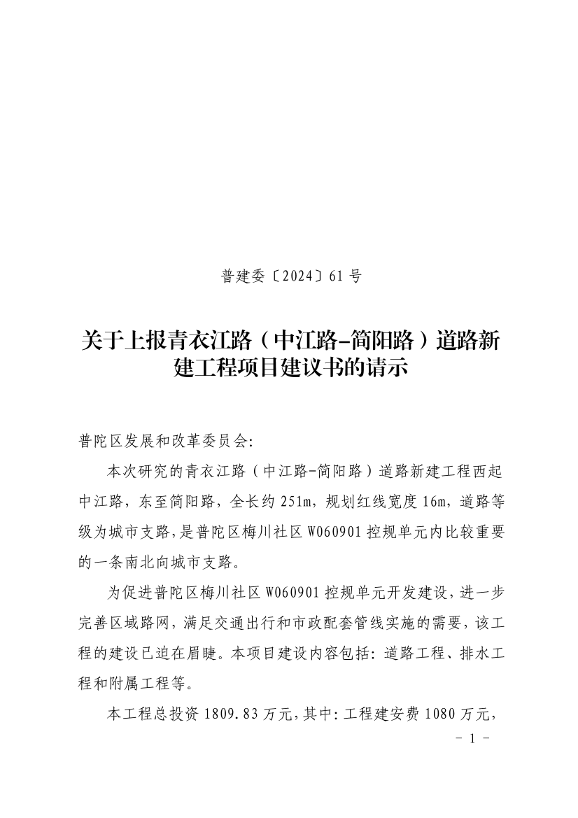 关于上报青衣江路(中江路-简阳路)道路新建工程项目建议书的请示