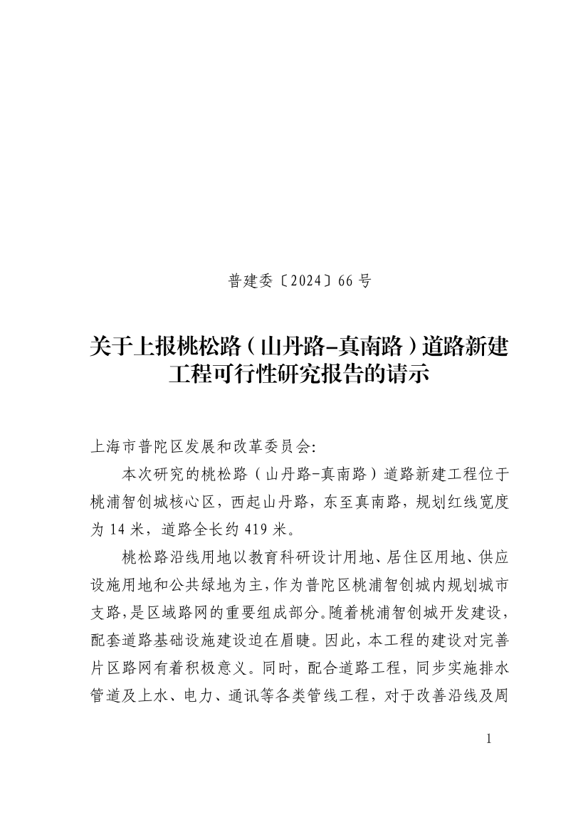 关于上报桃松路(山丹路-真南路)道路新建工程可行性研究报告的请示