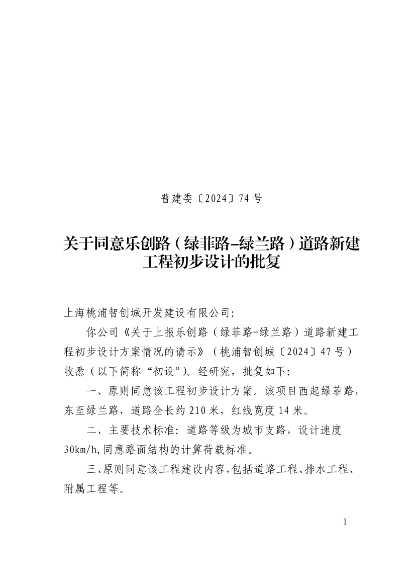 你公司《关于上报乐创路(绿菲路-绿兰路)道路新建工程初步设计方案情况的请示》(桃浦智创城〔2024〕47号)收悉(以下简称“初设”)。经研究,批复如下: