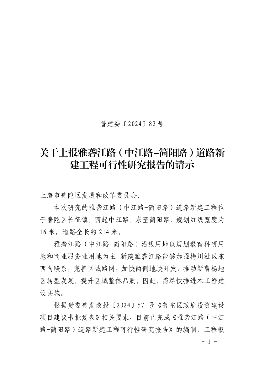 根据贵委普发改投〔2024〕57号《普陀区政府投资建设项目建议书批复表》相关要求,目前已完成《雅砻江路(中江路-简阳路)道路新建工程可行性研究报告》的编制,工程概况如下: