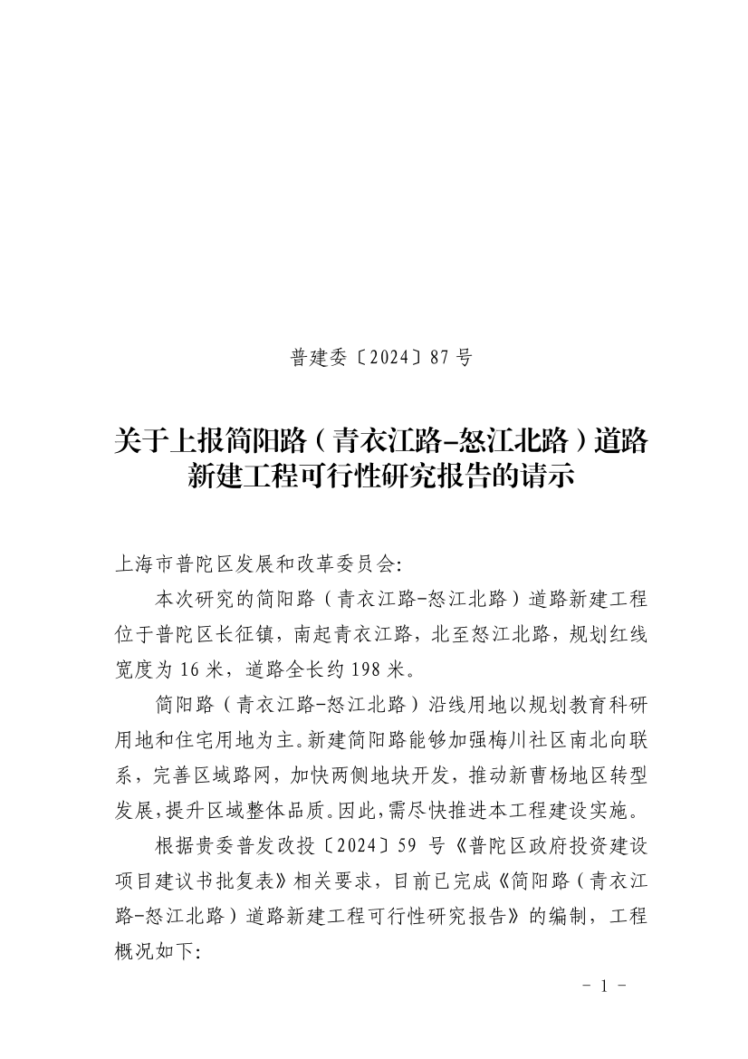 根据贵委普发改投〔2024〕59号《普陀区政府投资建设项目建议书批复表》相关要求,目前已完成《简阳路(青衣江路-怒江北路)道路新建工程可行性研究报告》的编制,工程概况如下: