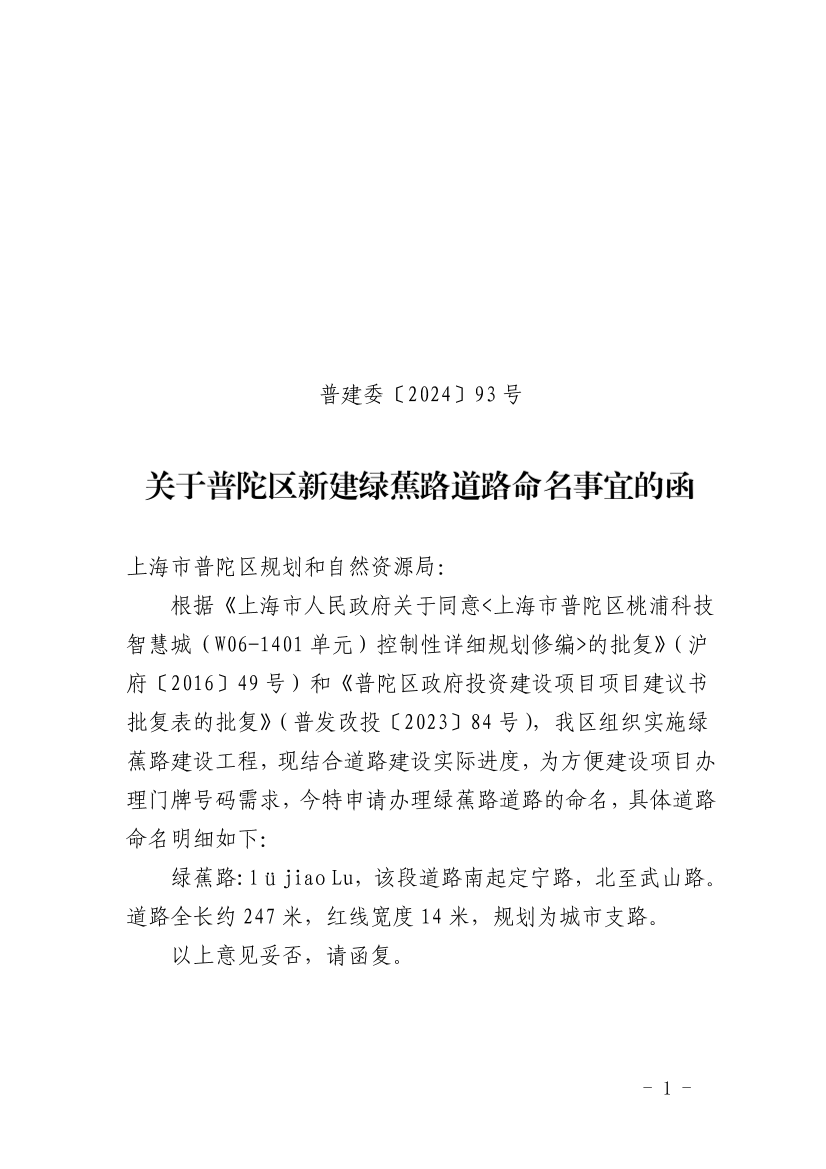 根据《上海市人民政府关于同意<上海市普陀区桃浦科技智慧城(W06-1401单元)控制性详细规划修编>的批复》(沪府〔2016〕49号)和《普陀区政府投资建设项目项目建议书批复表的批复》(普发改投〔2023〕84号),我区组织实施绿蕉路建设工程,现结合道路建设实际进度,为方便建设项目办理门牌号码需求,今特申请办理绿蕉路道路的命名,具体道路命名明细如下: