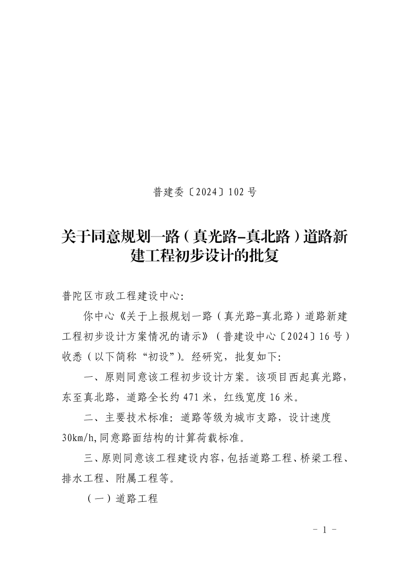 你中心《关于上报规划一路(真光路-真北路)道路新建工程初步设计方案情况的请示》(普建设中心〔2024〕16号)收悉(以下简称“初设”)。经研究,批复如下: