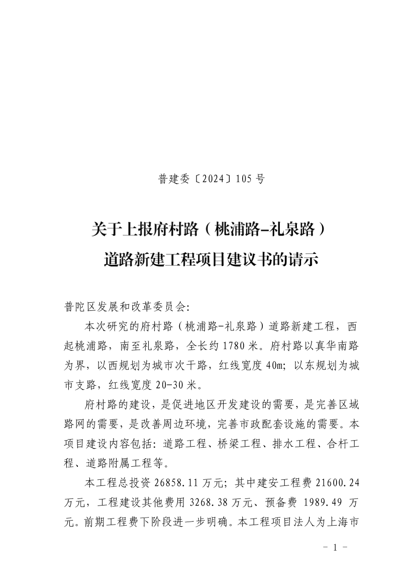 关于上报府村路(桃浦路-礼泉路)道路新建工程项目建议书的请示