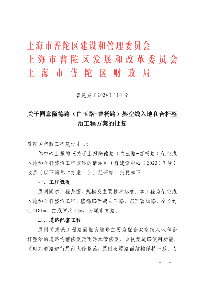 你中心上报的《关于上报隆德路(白玉路-曹杨路)架空线入地和合杆整治工程方案的请示》(普建设中心〔2023〕7号)收悉(以下简称“方案”)。经研究,批复如下: