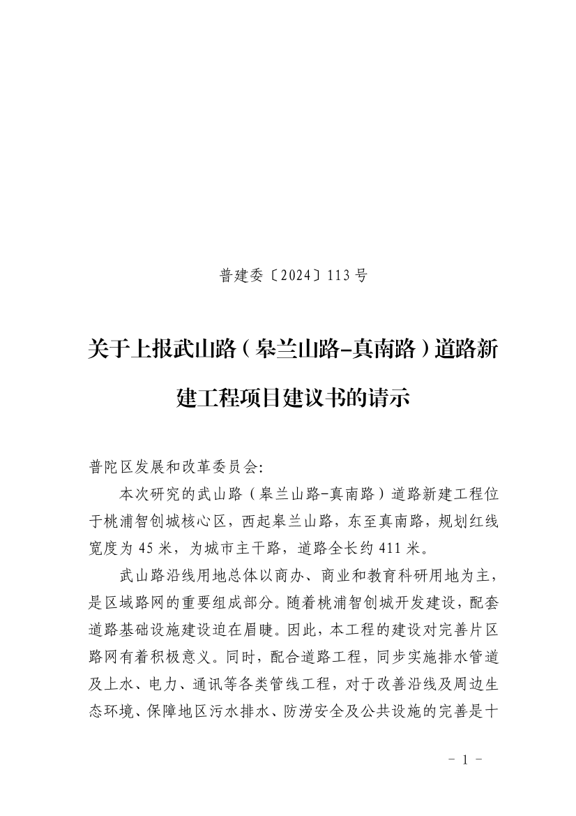 关于上报武山路(皋兰山路-真南路)道路新建工程项目建议书的请示