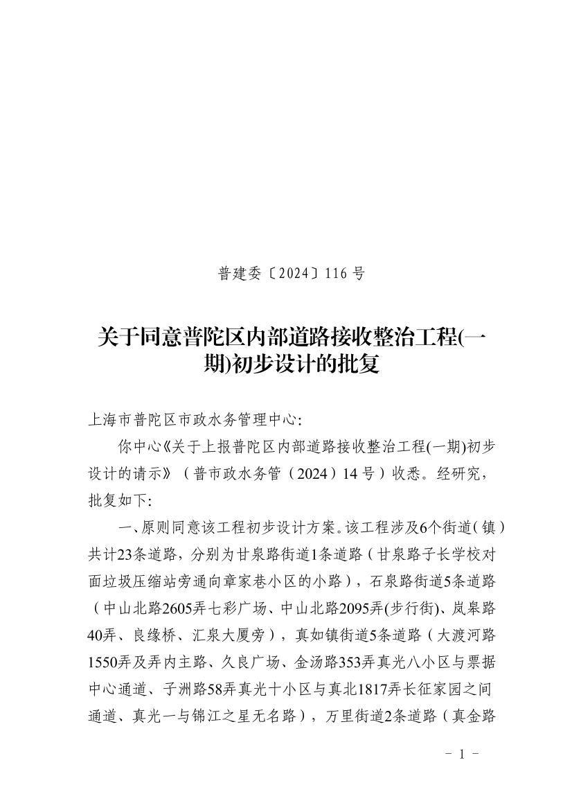 你中心《关于上报普陀区内部道路接收整治工程(一期)初步设计的请示》(普市政水务管(2024)14号)收悉。经研究,批复如下: