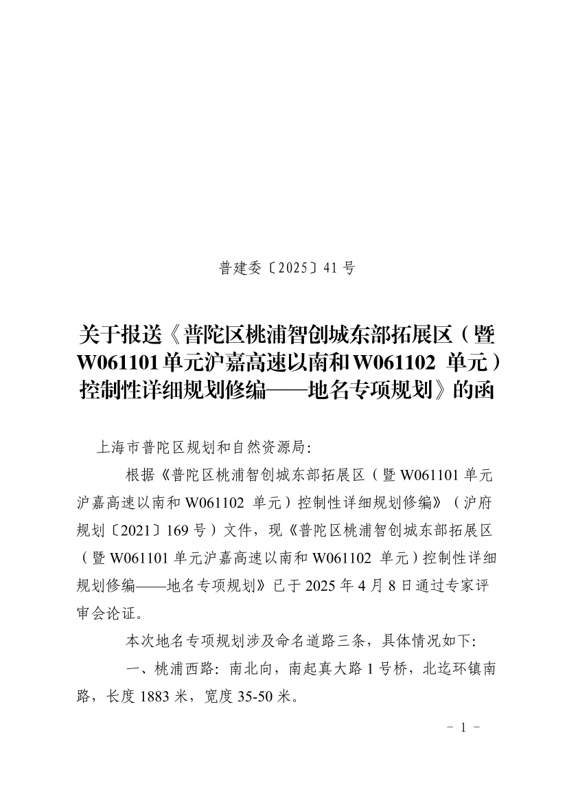 根据《普陀区桃浦智创城东部拓展区(暨W061101单元沪嘉高速以南和W061102 单元)控制性详细规划修编》(沪府规划〔2021〕169号)文件,现《普陀区桃浦智创城东部拓展区(暨W061101单元沪嘉高速以南和W061102 单元)控制性详细规划修编——地名专项规划》已于2025年4月8日通过专家评审会论证。
