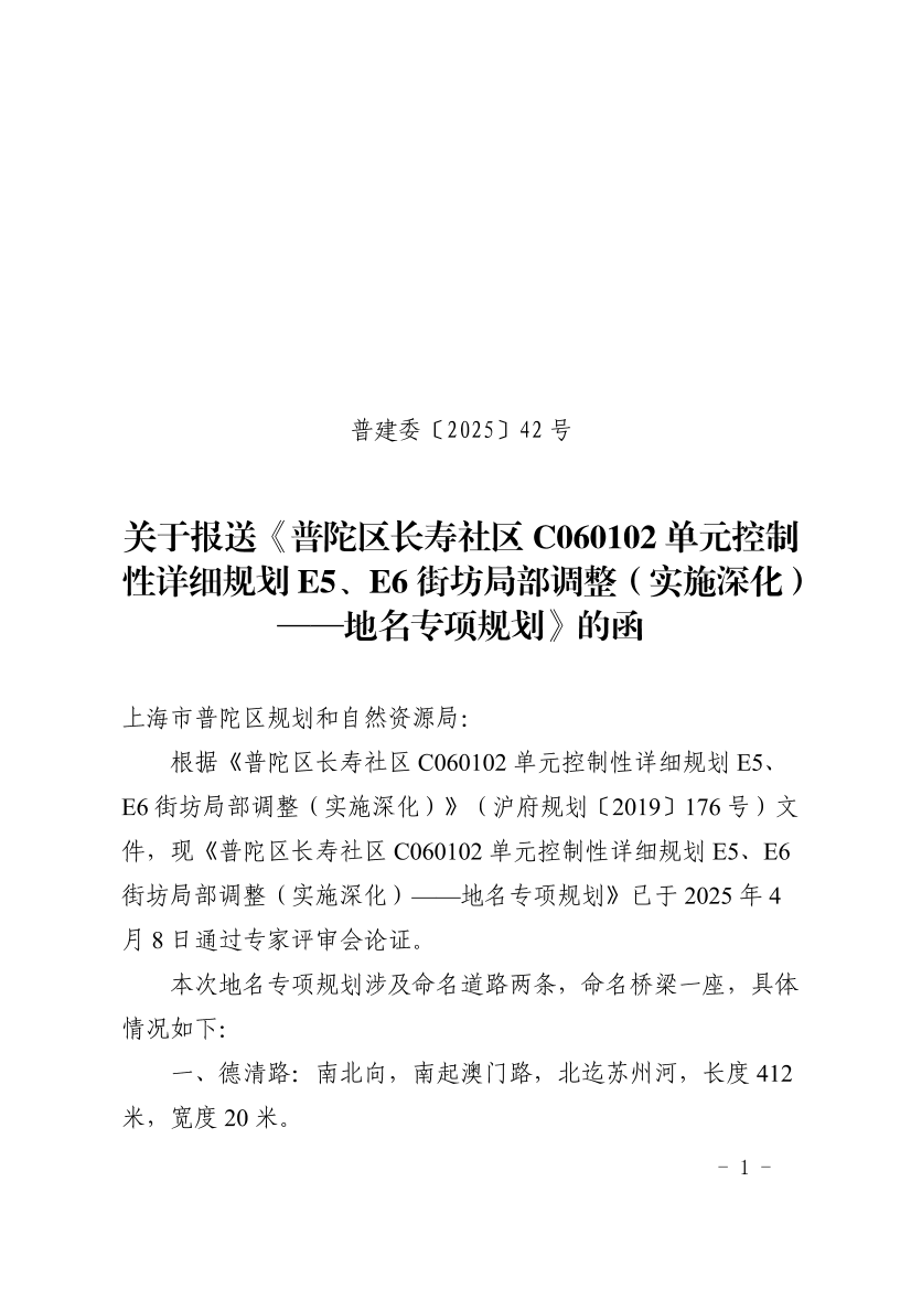 关于报送《普陀区长寿社区C060102单元控制性详细规划E5、E6街坊局部调整(实施深化)——地名专项规划》的函
